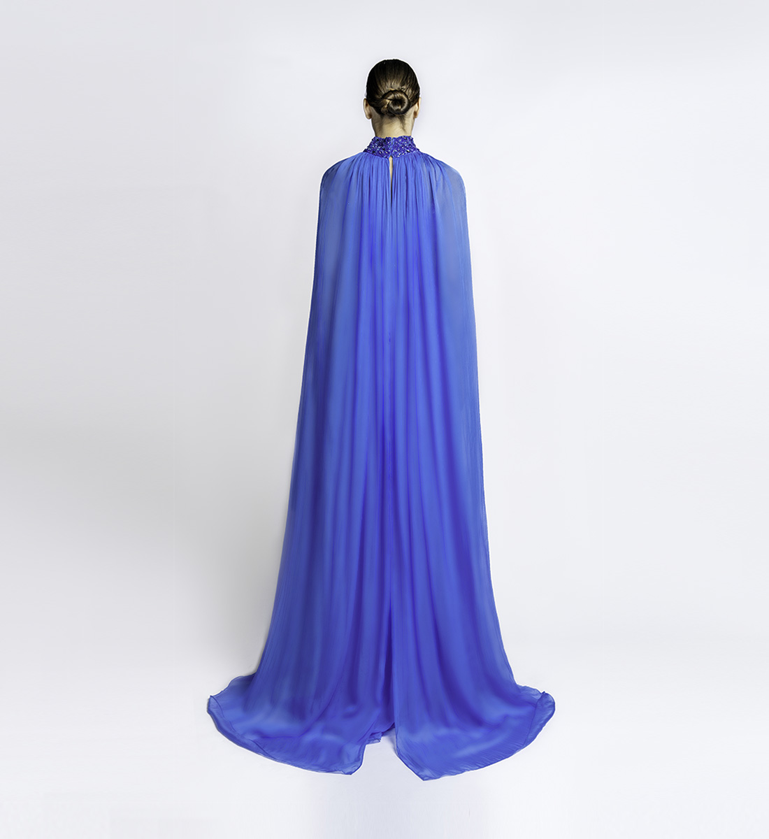This mulberry silk chiffon embroidered gored skirt dress with a detachable cape features hand beadwork embroidery on the bodice and neckline of the cape for added texture and detail.